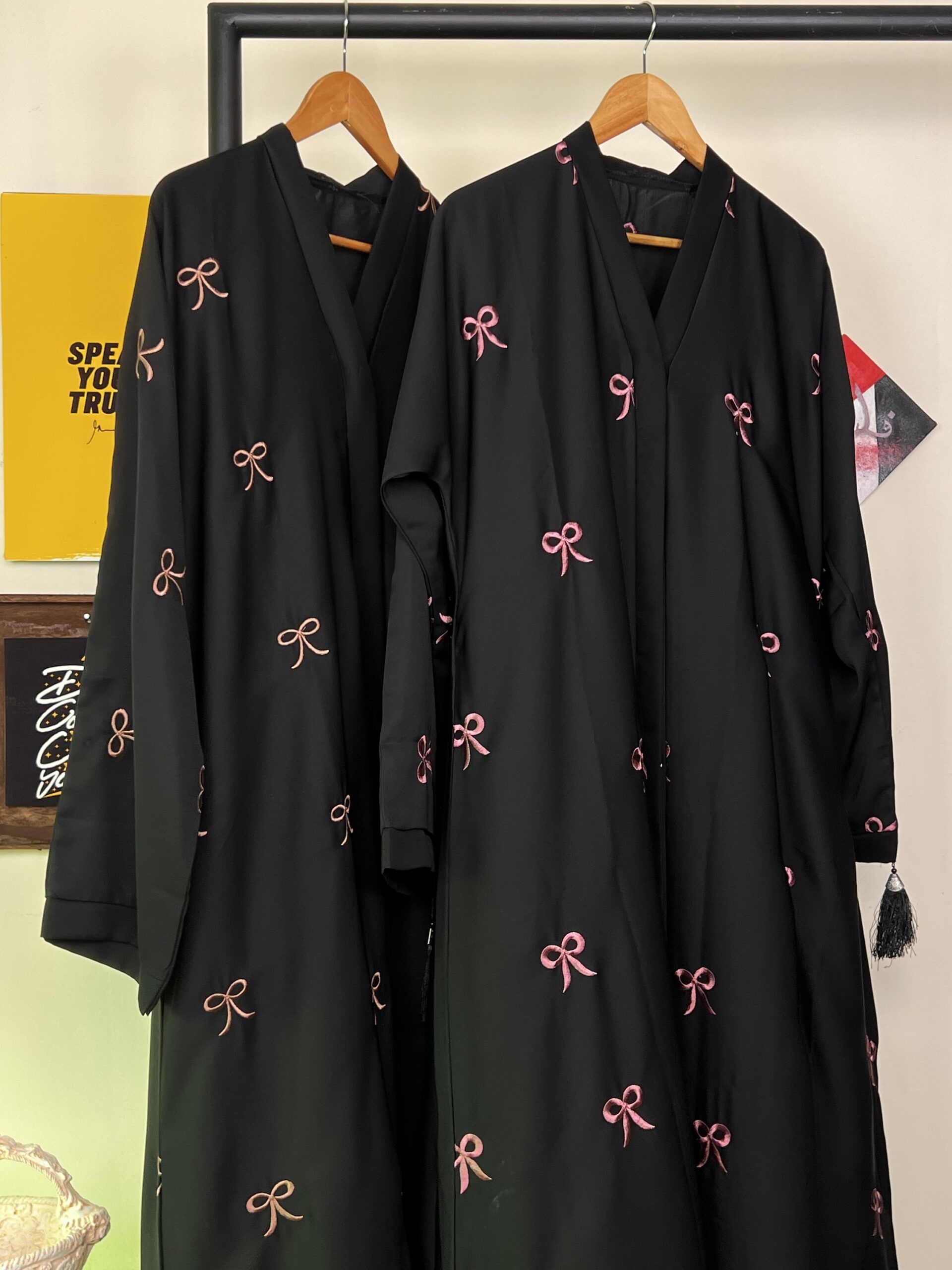 A luxurious new launch featuring delicate bow threadwork in rose and skin pink over rich black Nida fabric. This elegant abaya is soft, flowy, and full of grace — truly rich in every way. Limited stock available