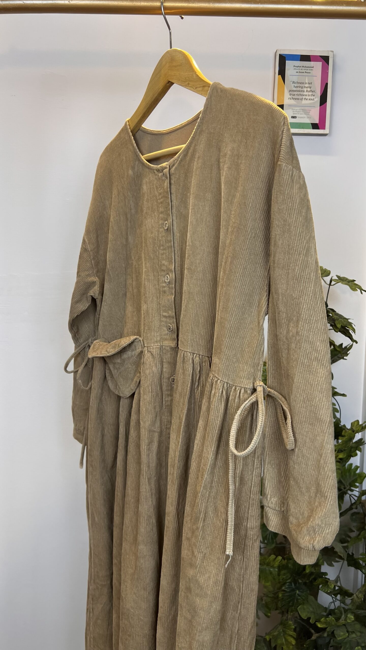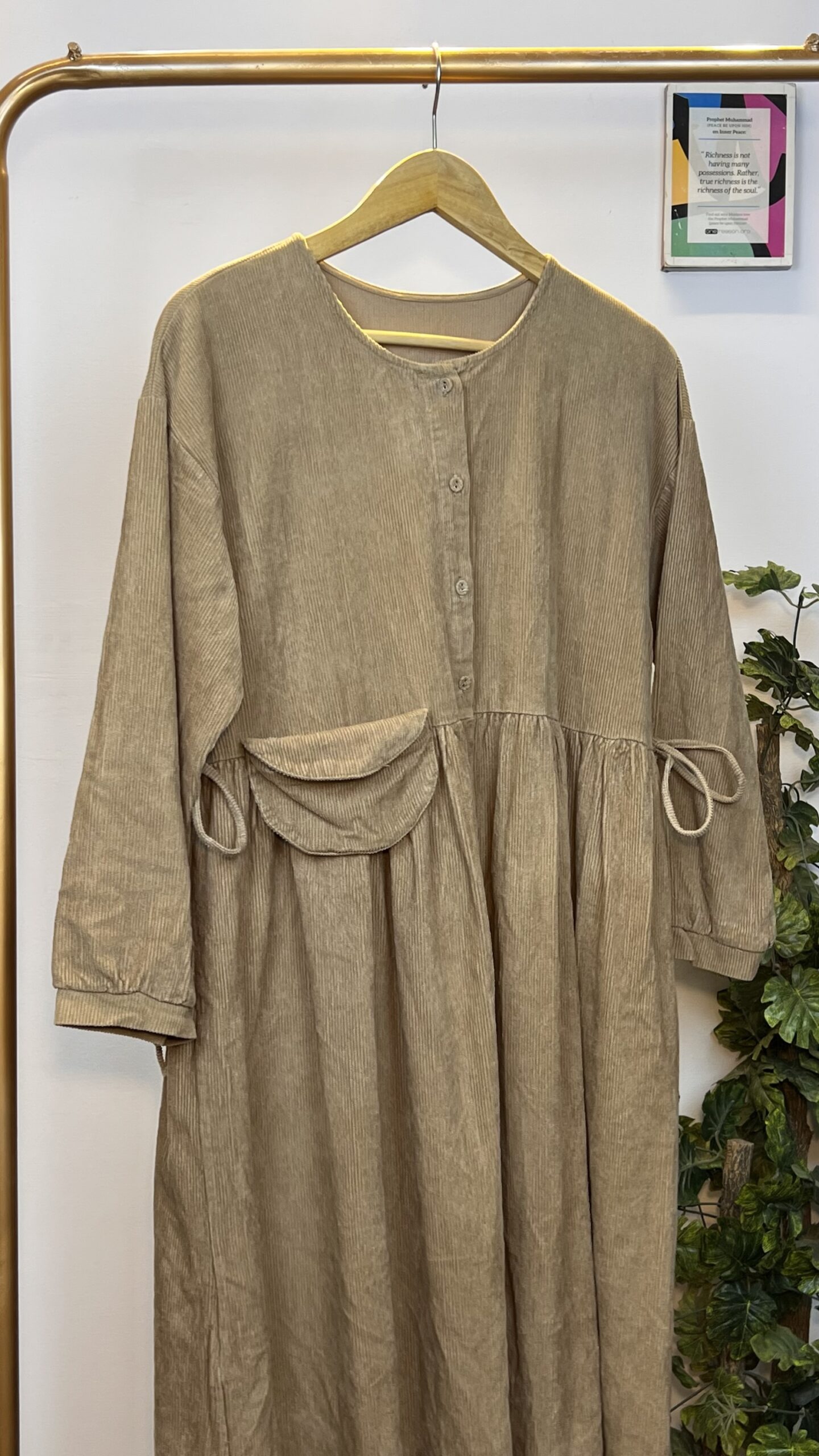 Crafted from premium soft corduroy fabric, this frock is designed for effortless elegance and all-day comfort. The flowy silhouette drapes beautifully, while the front button detail adds a touch of minimal sophistication. Featuring a delicate waist tie for a graceful fall and a functional side pocket for everyday ease, this design blends practicality with timeless style. The soft texture, modest length, and elegant cut make it perfect for winter wear, casual outings, and refined daily looks.
