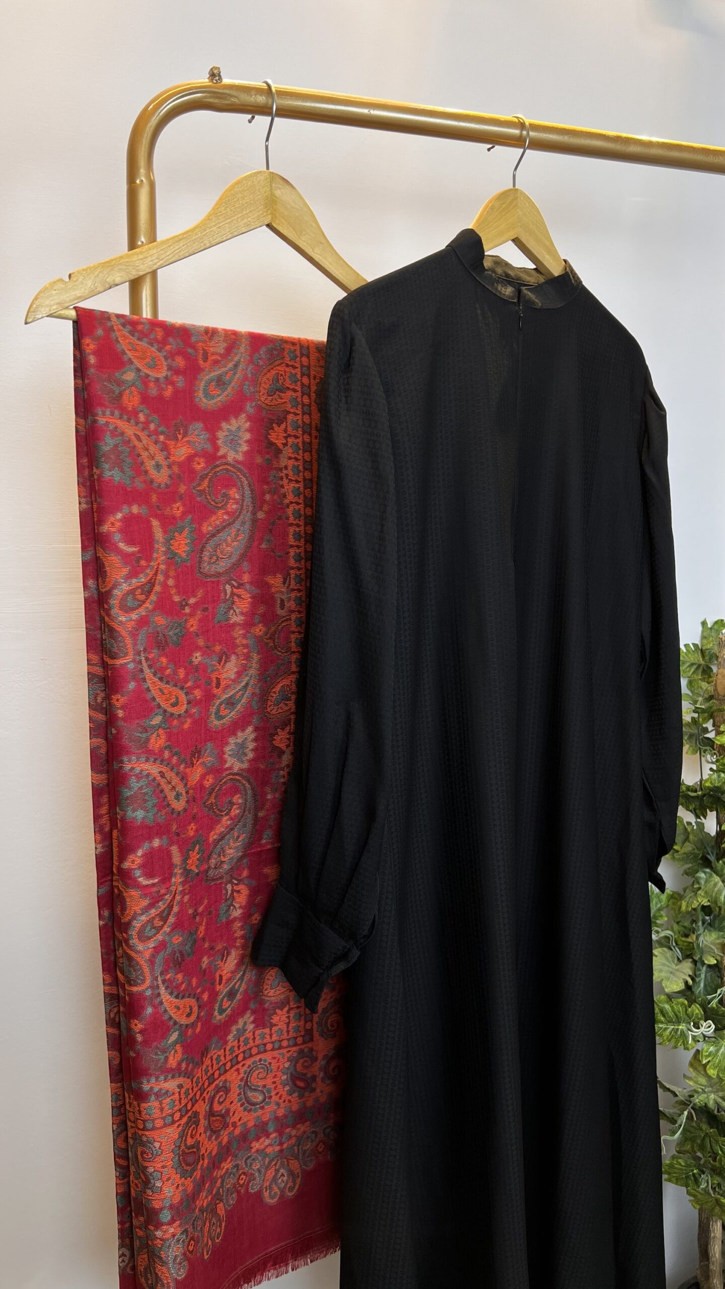 Hijab Included: Comes with a beautiful pashmina hijab featuring rich winter tones and intricate design, making it a complete seasonal outfit.