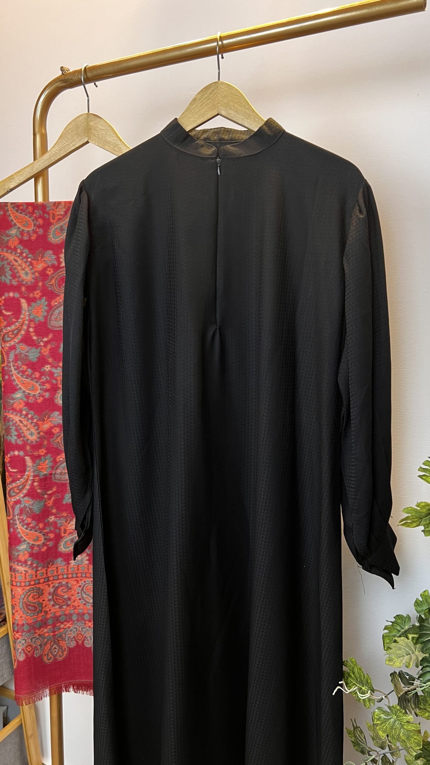 Design: Sleek black abaya with a smooth fall and modest full-length silhouette.